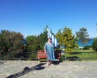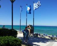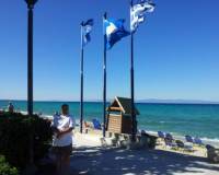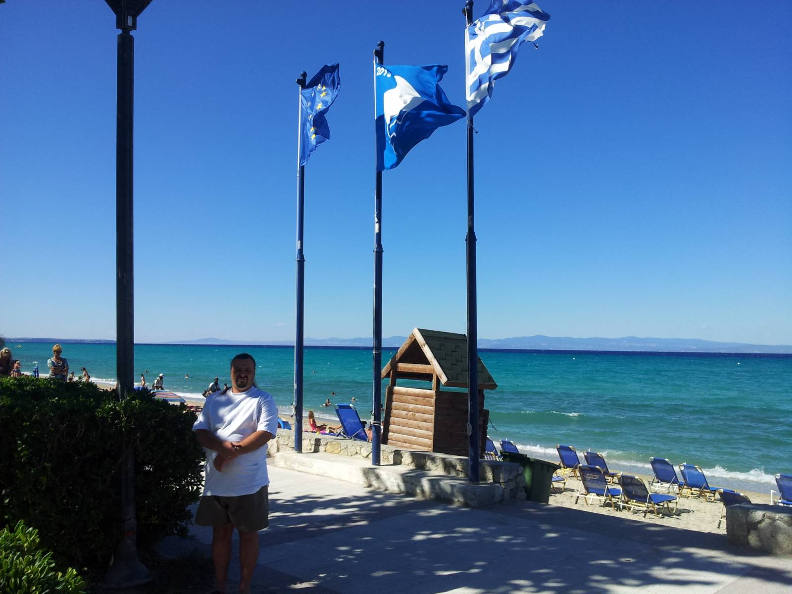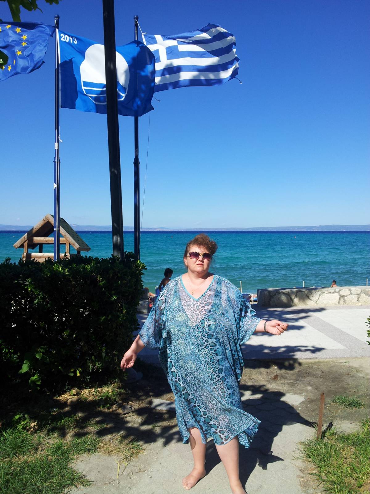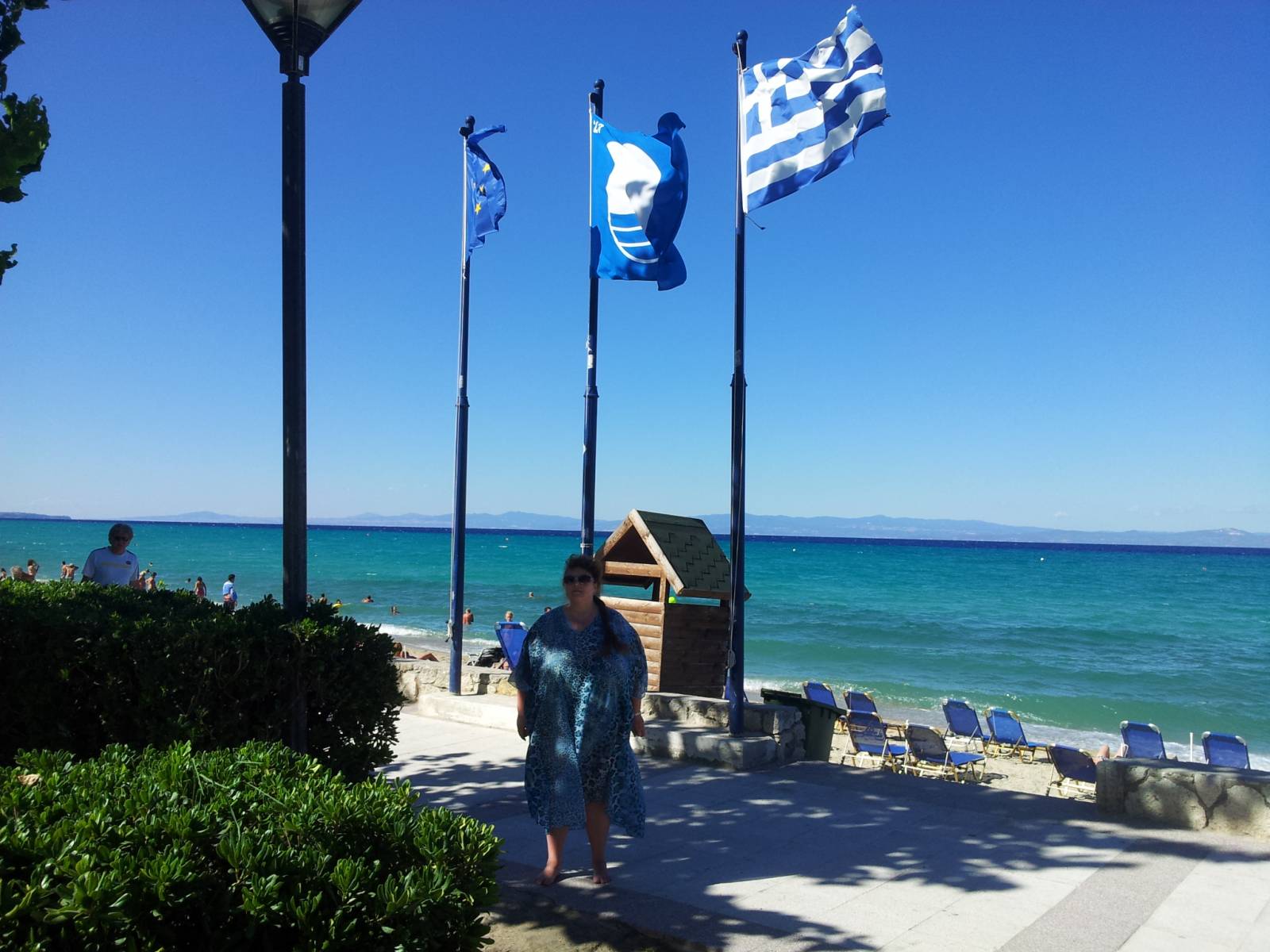 Позади Дуси - три флага. ЕС, голубой флаг самого чистого пляжа, Государственный Флаг Греции.